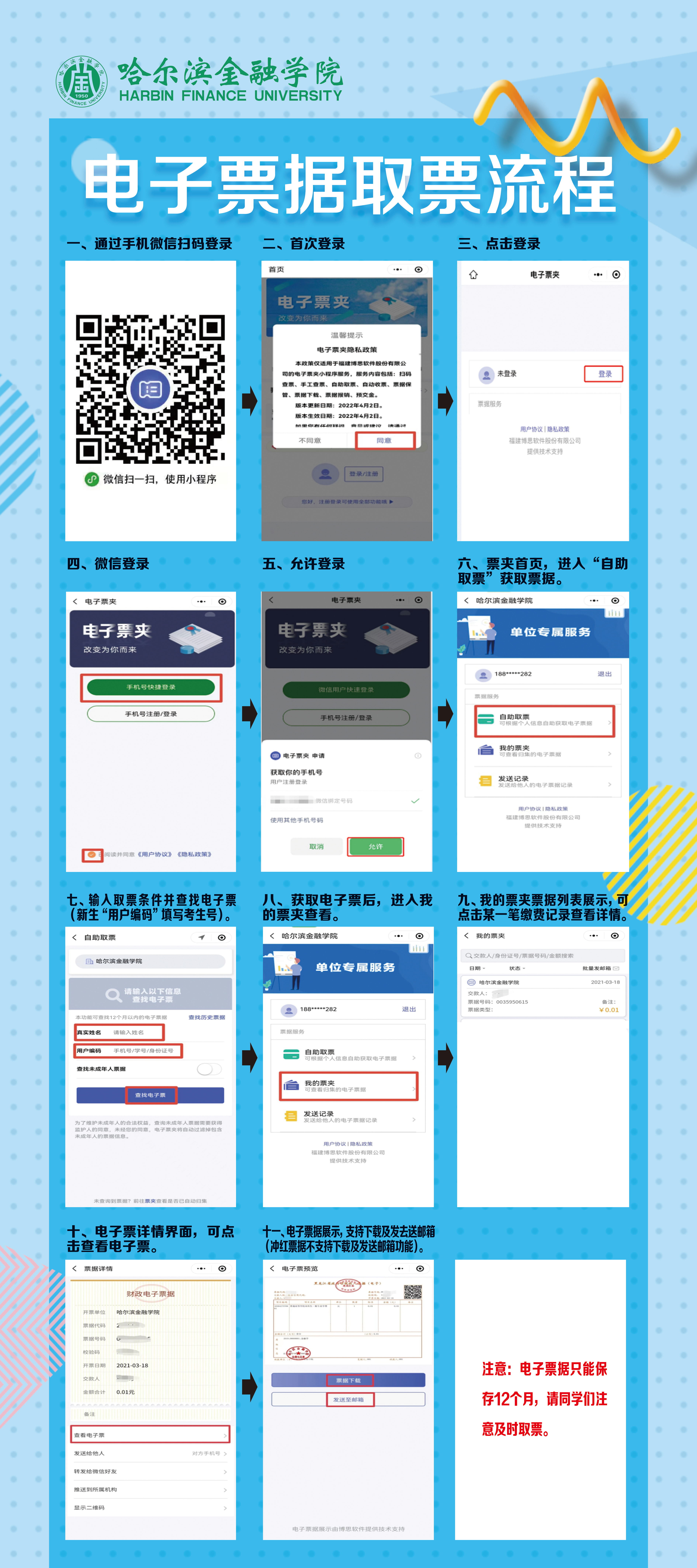 | 亲爱的2025级同学: 欢迎加入哈尔滨金融学院,请认真阅读下面的缴费须知,以便顺利完成缴费。 一、缴费方式及流程 新生缴费方式有两种: 微信缴费和现场缴费。 (一)微信缴费流程 1.微信搜索关注“哈尔滨金融学院财务处”公众号。 2.点击菜单栏“学生服务”,选择子菜单“学生认证”,根据提示输入考生号、姓名、身份证号信息进行认证。 3.点击菜单栏“学生服务”,选择子菜单“学宿费缴费”,选择所需要交纳的费用项目,点击下方“提交”按钮。 4.进入支付界面,点击“确认支付”,输入支付密码完成缴费。 (二)现场缴费流程:新生报到日持现金、银行卡或微信支付在实验中心一楼大厅缴费,入学后可至财务处收费与信息科(综合楼240室)办理。 以上两种缴费方式,请优先选择第一种方式,通过微信公众服务平台完成缴费的学生,报到时直接办理流程单中所列其他事项。 二、缴费时间及标准 (一)缴费时间 1.微信公众平台缴费:2025年9月6日0:00起。 2.现场缴费:新生报到日。 (二)缴费标准 1.学费标准 | 序号 | 专业名称 | 收费标准(元∕生.年) | | 1 | 金融学 | 5000 | | 2 | 保险学 | 5000 | | 3 | 会计学 | 4500 | | 4 | 财务管理 | 4500 | | 5 | 电子商务 | 5000 | | 6 | 商务英语 | 5000 | | 7 | 国际经济与贸易 | 4500 | | 8 | 市场营销 | 4500 | | 9 | 信用管理 | 4500 | | 10 | 投资学 | 5000 | | 11 | 计算机科学与技术 | 4500 | | 12 | 审计学 | 4500 | | 13 | 税收学 | 4500 | | 14 | 金融工程 | 5000 | | 15 | 知识产权 | 5000 | | 16 | 软件工程 | 5000 | | 17 | 劳动与社会保障 | 4500 | | 18 | 人力资源管理 | 4500 | | 19 | 金融科技 | 4500 | | 20 | 数字经济 | 4500 | | 21 | 信用风险管理与法律防控 | 4500 | | 22 | 数据计算及应用 | 4500 | | 23 | 体育经济与管理 | 4500 | 2.住宿费标准 | 序号 | 住宿标准 | 收费标准(元∕生.年) | | 1 | 6人间 | 800 | | 2 | 4人间 | 1200 | 三、电子票据取票流程 学生完成缴费后可领取电子票据,取票流程如下: |