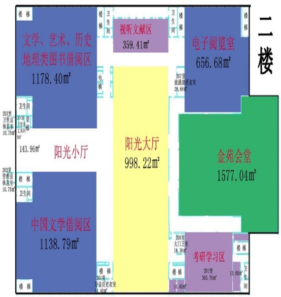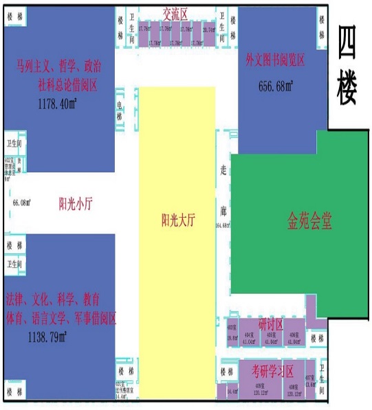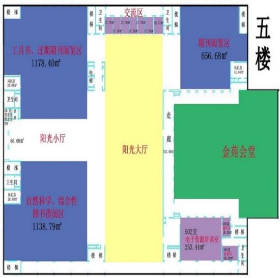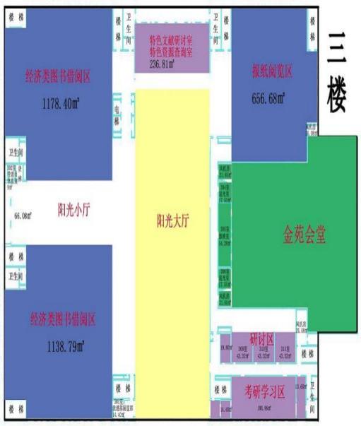 二、馆藏布局图 图书馆设有借阅区、功能区和阅览区。 图书馆一楼包含:办公区 图书馆二楼包含:1.文学理论、世界文学、各国文学和中国文学类书籍;2.电子阅览室;3.新媒体文献体验区;4.考研间自习室;5.金苑会堂。 图书馆三楼包含:1.农业经济、工业经济、交通经济、邮电经济、贸易经济、财政金融、经济学、世界经济、经济管理类书籍;2.报纸阅览区;3.特色文献查阅室(教师阅览室);4.考研间自习室。 图书馆四楼包含:1.马列主义、哲学、社科总论、政治、法律、文化、科学、教育、体育、语言文字、军事类书籍;2.外文图书阅览区;3.研讨室;4.考研间自习室。 图书馆五楼包含:1.工具书、过刊、自然科学、综合性图书;2.期刊阅览区;3.电子资源培训室;4.研讨室。 三、金融特色馆藏建设专区 图书馆注重特色文献馆藏建设,逐步搭建金融学科综合服务平台,构建文献保障体系,建设具有印刷型文献、本地数字化文献和网上文献信息多元化的金融文献信息资源及利用体系。每年设专项采购计划,丰富金融类文献资源,现馆藏金融类图书2万7千余种。组建“智慧图书馆金融机构知识库”,依据学校金融学科知识体系构建检索平台,实现金融学科全球资源的统一整合和快速推送,进行知识资源专业、精准匹配,可检索金融类外文资源170万余条,可获取金融类中文电子图书6万6千余种,已形成金融特色突出的馆藏体系,为学校师生提供及时、全面、专业、权威的信息保障。 1.特色馆藏区:位于馆内三楼,集各种金融相关资源为一体,便于师生查找使用。